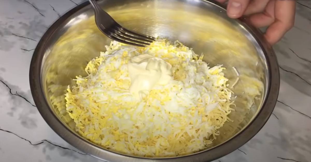 Ugotowane na twardo jajka zetrzeć na tarce o mniejszych oczkach. To samo robimy z twarogiem. W osobnym naczyniu umieszczamy utarte jajka i ser, dodajemy czosnek i majonez. Doprawiamy solą według uznania. Całość mieszamy do uzyskania jednolitej masy. Nie powinna być zbyt rzadka.