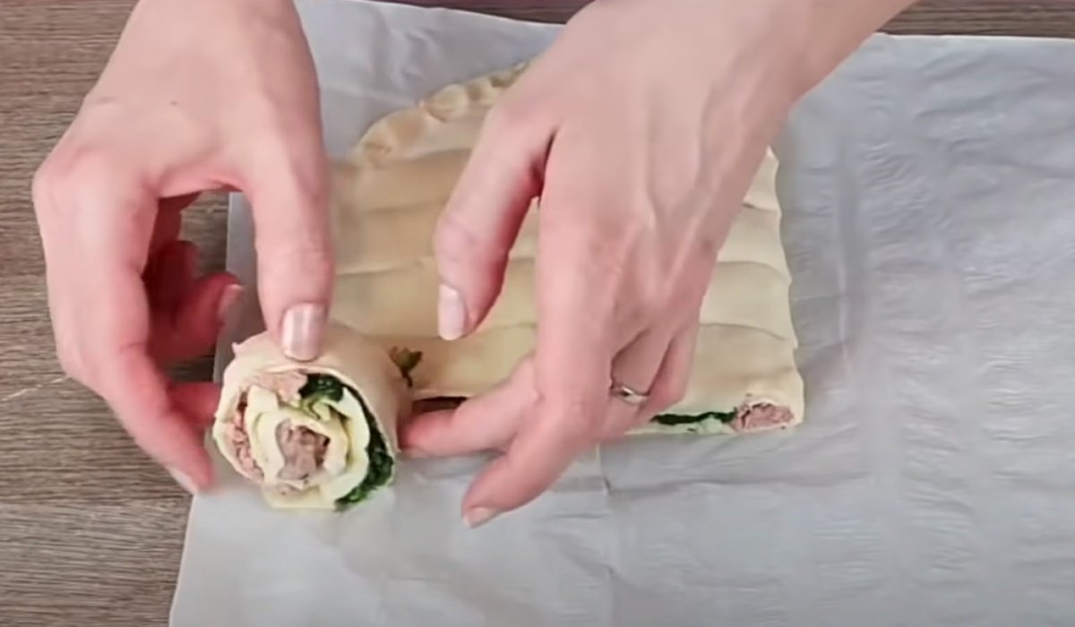 Posmaruj wierzch ciasta francuskiego jednym ubitym żółtkiem. Szpinak sparz w osolonej wodzie. Na połowę ciasta połóż starty ser, posiekane parówki i szpinak. Złóż arkusz ciasta na pół i dociśnij krawędzie. Za pomocą noża do pizzy lub ostrego noża pokrój powstałe półkole w poprzek na 8 kawałków. Zwiń je w rulon.