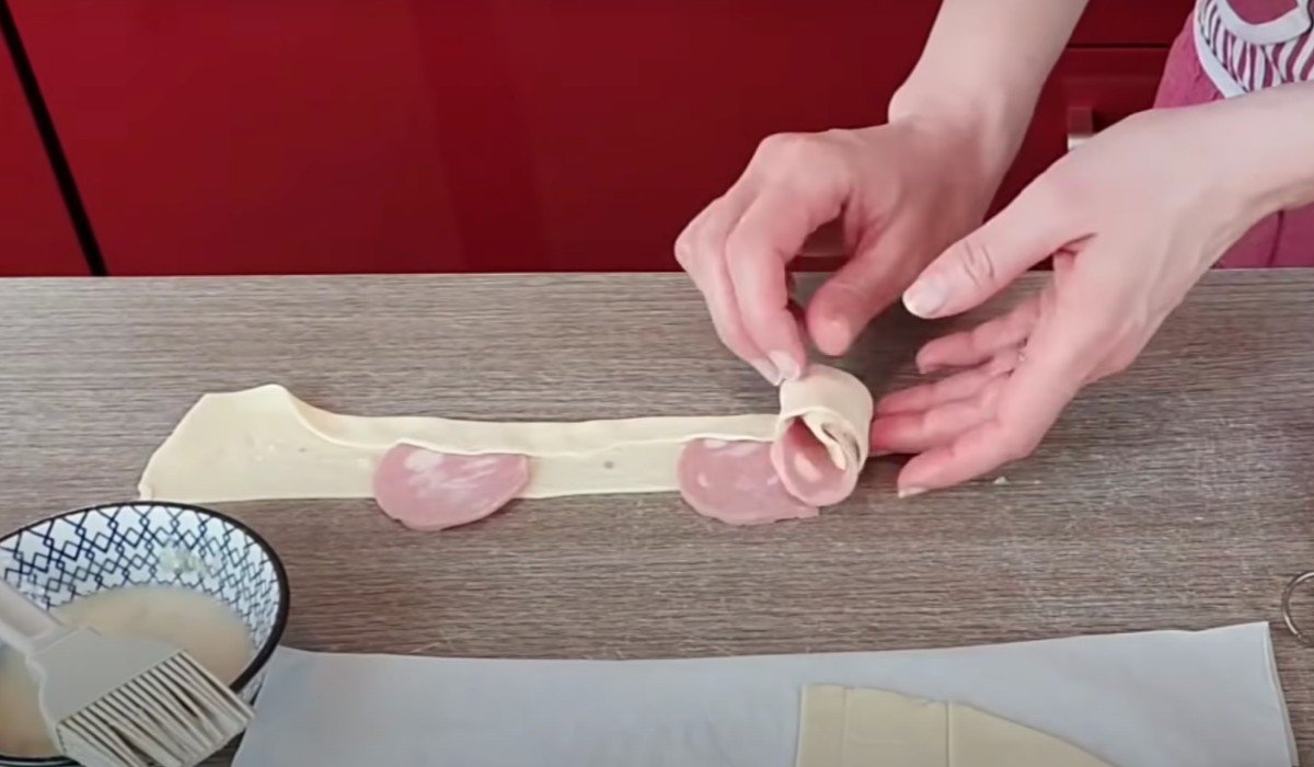 W kąpieli wodnej rozpuść gorgonzolę w 1 łyżce mleka i odstaw do całkowitego rozpuszczenia. Ciasto francuskie podziel na 6 pasków za pomocą ostrego noża. Każdy pasek posmaruj kremem gorgonzola i ułóż na wierzchu po trzy kawałki kiełbasy w równej odległości od siebie, cofając się o 1 cm od dolnej krawędzi. Złóż wolny brzeg tak, aby przykrył kiełbasę. Następnie zwiń go w rolkę tworząc różyczki.
