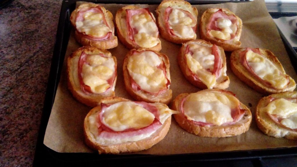 Jajka wymieszaj z tartym serem i drobno posiekaną szynką – jeśli chcesz, możesz dodać śmietanę. Posmaruj kromki chleba masłem i ułóż cienką warstwę przygotowanej mieszanki. Ułóż zapiekanki na blasze do pieczenia i wstaw do rozgrzanego piekarnika na około 15-20 minut. Smacznego!