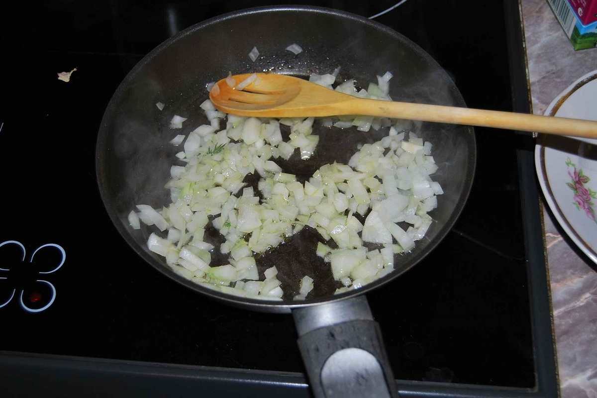 Podczas, gdy ciasto czeka na swoją kolej, zabieramy się za przyrządzenie farszu do ciastek. Zaczynamy od cebulki – obieramy ją i siekamy, a następnie podsmażamy na rozgrzanej uprzednio masłem patelni.
