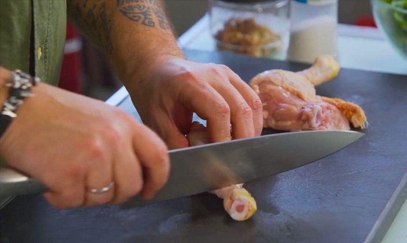 Lepiej ugotować danie nie z fileta, ale z całego kurczaka, aby rolada była bardziej soczysta. Dlatego najpierw musisz pokroić kurczaka, oddzielając kości. Nie odcinamy tłuszczu i skóry, zostawiamy ją na mięsie. Jako przykład pokażemy, jak przygotować roladę z niewielkiej ilości podudzi z kurczaka. Ale jeśli chcesz gotować dla całej rodziny, lepiej zrobić więcej. Zapewniamy, że z dania nic nie zostanie!