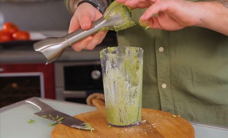 Do kubka blendera wrzuć kilka obranych ząbków czosnku, cebulę i dodaj posiekaną bazylię. Musisz również dodać masło i orzechy. I wszystko dobrze miksujemy. Nawiasem mówiąc, zamiast bazylii możesz użyć dowolnej zieleni: pietruszki, kopru lub szpinaku.