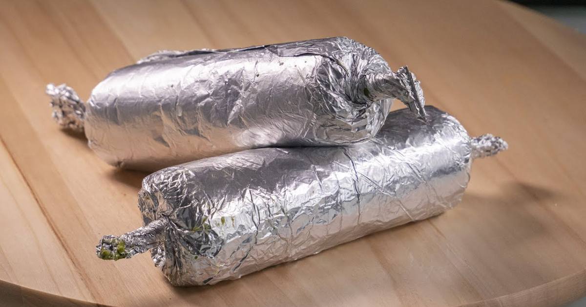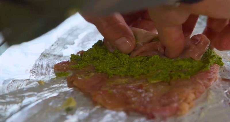 Folię lekko posmaruj masłem. Połóż nasze kawałki kurczaka z pastą z blendera i szczelnie zawiń w folię.