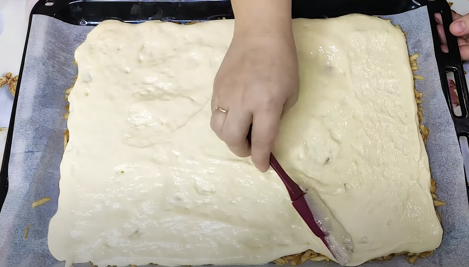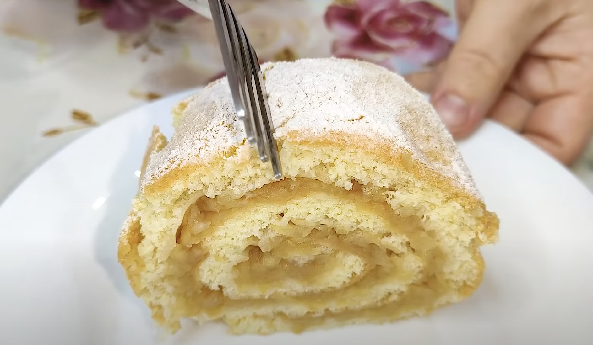 Połóż 4 starte jabłka na blaszce, zalej ciasto i zwiń. Powstaje rolada jabłkowa, słodka, delikatna i rozpływająca się w ustach