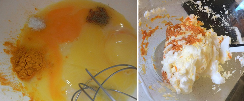 Odstawiamy marchewki do ostygnięcia. W tym czasie oddzielamy żółtka od białek. Ubijamy żółtka, sól, kurkumę i inne przyprawy. Do tego delikatnie dodajemy już schłodzone marchewki.