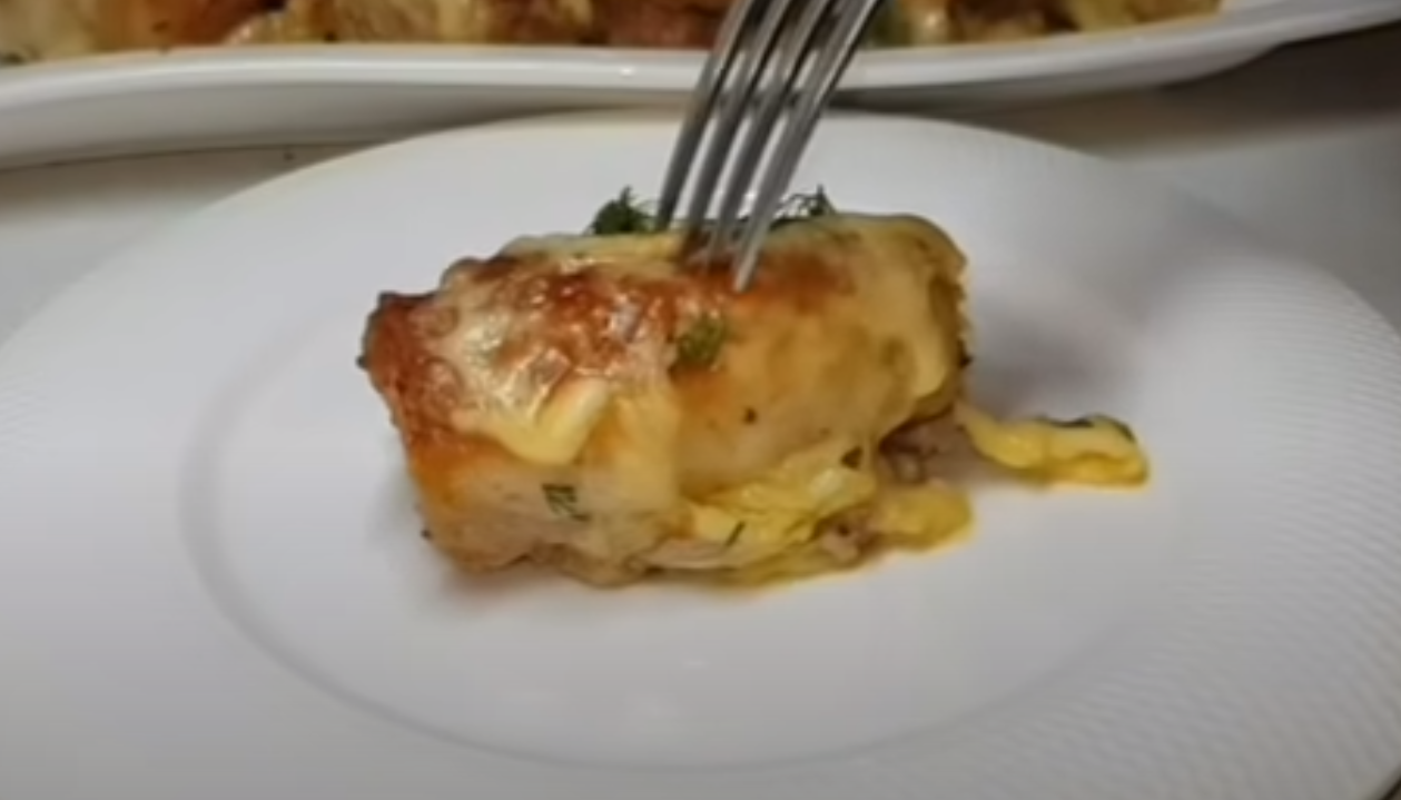 Parę minut przed końcem wyjmij naczynie z piekarnika, posyp roladki tartym serem i zapiecz. Gotowe!