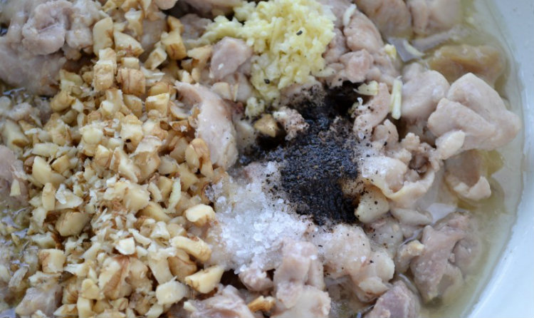 Zostaw mięso, aby ostygło, a następnie oddziel je od kości, jeśli jest taka potrzeba. Rozpuszczoną wcześniej żelatynę wymieszaj z bulionem. Następnie na suchej patelni delikatnie podsmaż orzechy.