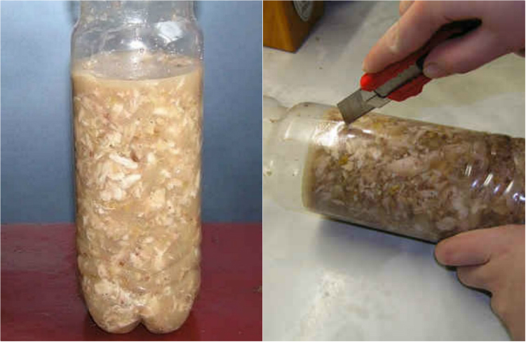 Po wykonaniu tego wypełnij ją całkowicie schłodzoną mieszaniną. Butelkę pozostaw w lodówce na kilka godzin, aż zawartość całkowicie stężeje. Wyjmij mieszaninę. Pamiętaj o ostrożnym i uważnym rozcinaniu butelki!
