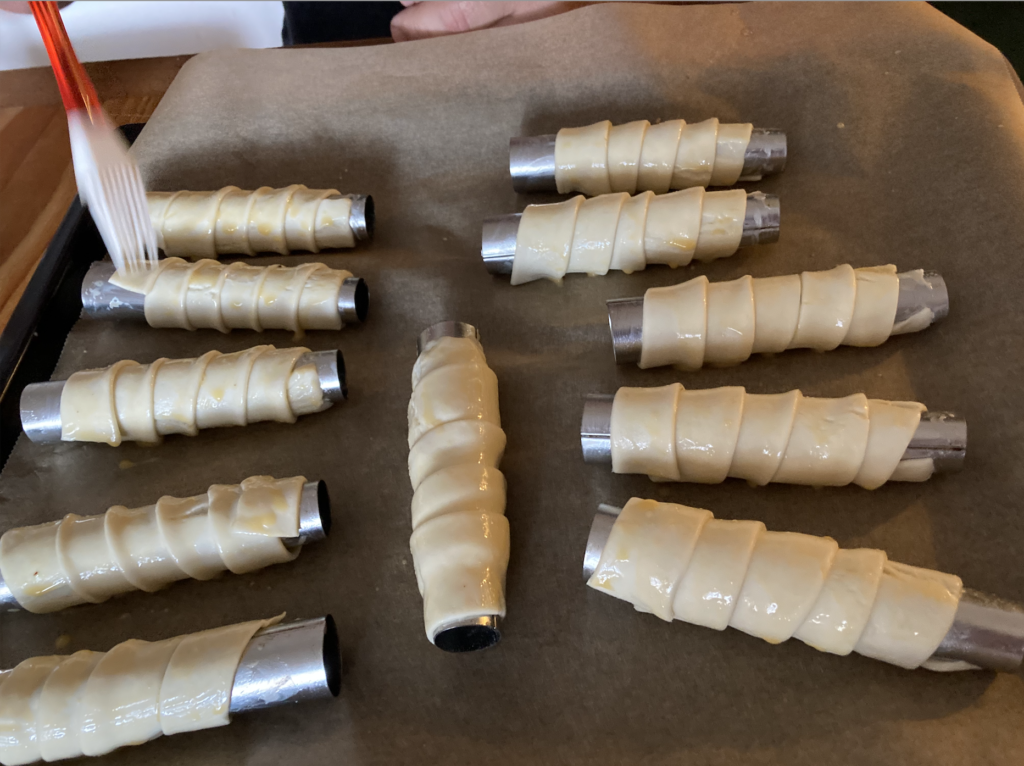 Pokrój je w około dwu centymetrowe paski. Nawijaj je na metalowe foremki rurki. Posmaruj je rozkłóconym jajkiem. Wstaw do uprzednio nagrzanego piekarnika do 180 °C. Piecz tak długo, aż staną się rumiane i złociste. (Przez mniej więcej 12-15 minut)