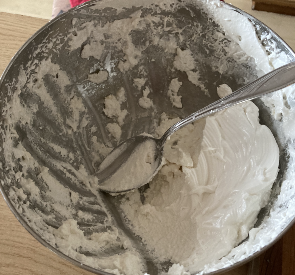 Zagotuj drobny cukier razem z wodą w garnku na kuchence to temperatury 115/120 °C. (Wody dodaj tylko tyle, aby przykryła cukier.) Wlej to powoli do ubitych białek i cały czas ubijaj. Poczekaj aż przestygnie i wstaw na chwilę do lodówki, aby masa była bardziej plastyczna.