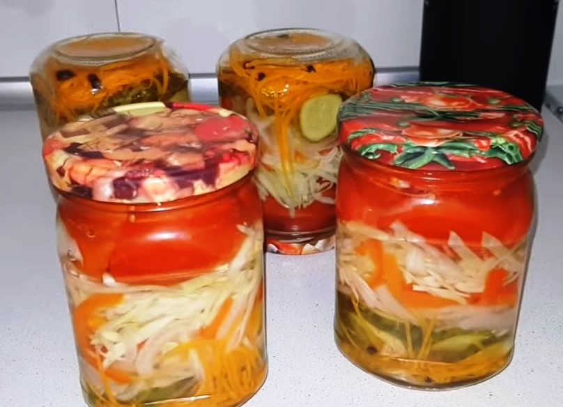 Pokrój ogórki w plastry, pomidory w plastry. Cebulę w cienkie półpierścienie, a pieprz w paski. Zetrzyj w paski, a marchewki w cienkie paski. Kubki i pokrywki należy wysterylizować.
