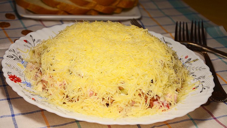 Kiełbasy nie solić ani nie doprawiać majonezem. Następnie ścieramy jajka i wykładamy je w następnej warstwie. Znowu smarujemy majonezem. Następnie są warstwy pokrojonego w kostkę ogórka i startej surowej marchewki. Znowu posmaruj majonezem. Następnie pieczarki pokrój w kostkę i posmaruj majonezem.