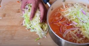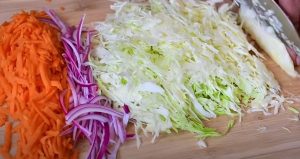 Oczyść marchewkę i zetrzyj ją na grubej tarce. Czerwoną cebulę pokroić w cienkie plasterki. Pokrój również ćwiartkę kapusty bez skóry w cienkie paski.
