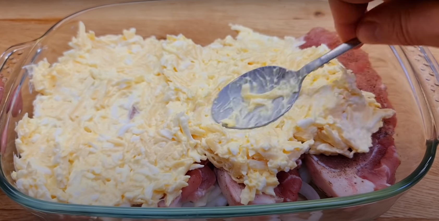 Następnie pokrój cebulę w kostkę i wyłóż na dnie naczynia żaroodpornego. Połóż na niej schab. Zetrzyj ser i jajka na tarce, dodaj do nich majonez i nieco soli.