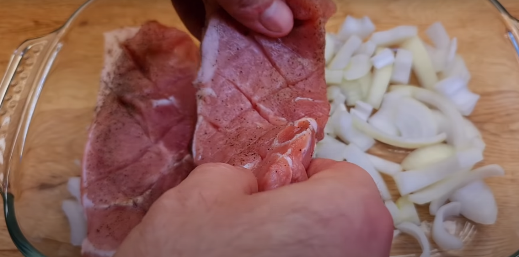 Ponacinaj mięso nożem, tak by utworzyć regularną „siatkę”. Posyp je solą, pieprzem i ewentualnie innymi przyprawami.
