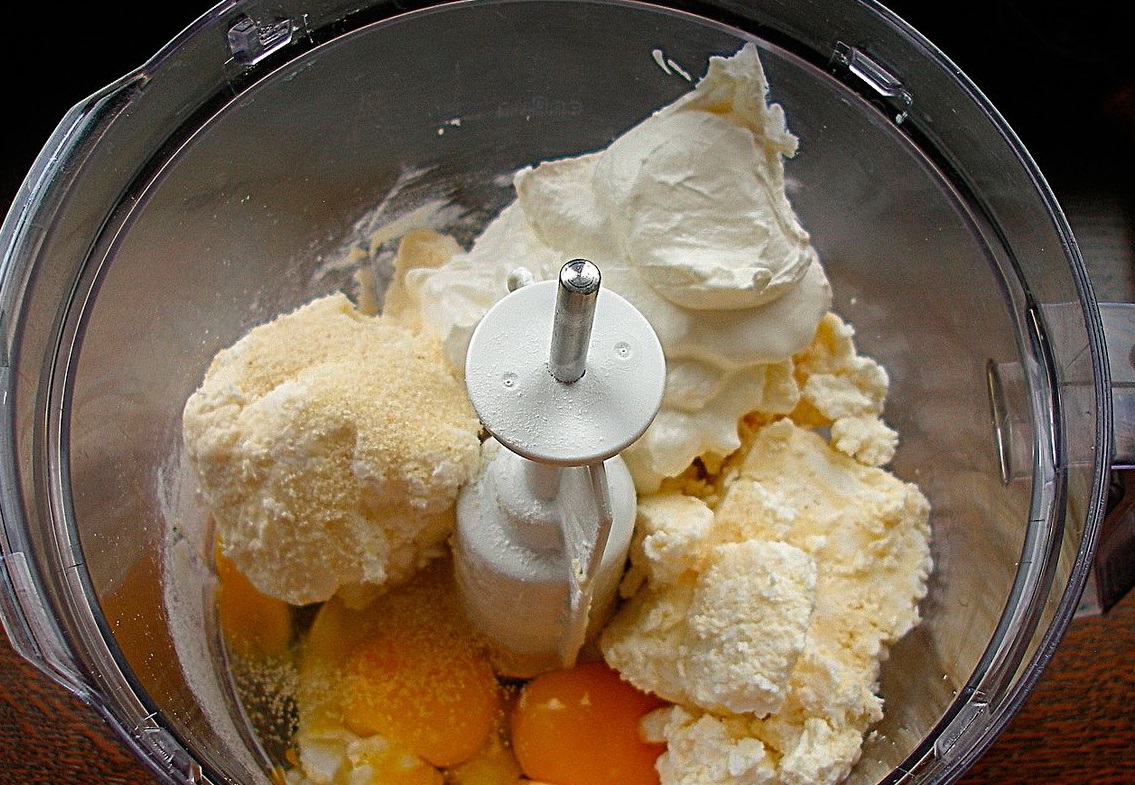 Do przygotowanej mieszanki dodaj jedno jajko i 100 gram cukru i zacznij delikatnie wyrabiać ciasto. Konsystencja, do której dążymy, powinna być miękka i dość elastyczna. Po wyrobieniu ciasta wstaw je do lodówki na 30 minut. Weź kolejną miskę i dodaj do niej resztę jajek, śmietanę, cukier biały, cukier wanilinowy i twarożek. Wszystko dokładnie wymieszaj na jednolitą masę.