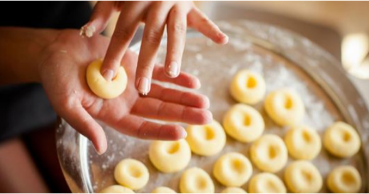 Z gotowej masy odrywaj po kawałku i twórz kuleczki wielkości orzecha włoskiego. W każdej kuleczce zrób dziurkę, poprzez naciśnięcie jej na środku palcem. Uformowane kuleczki z dziurką wrzuć do gotującej się, osolonej wody. Mieszaj co jakiś czas, aby nie przykleiły się do dna. Gdy wypłyną na powierzchnię, gotuj jeszcze przez 2 minuty.