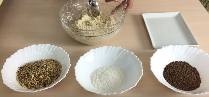 Do twarogu z cukrem i wanilią dodać zmielone ciastka i orzechy. Wymieszać wszystkie składniki. Z powstałej masy formować średniej wielkości kule, a następnie obtaczać je w wybranym przez siebie produkcie.