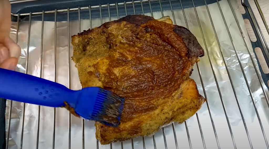 Marynatę przełóż do garnka i gotuj do osiągnięcia gładkiej masy. Po upieczeniu mięsa usuń folię i pokryj ze wszystkich stron przygotowaną marynatą.