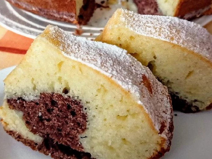 Ubij białka, aż utworzy się sztywna piana. Żółtka ubić z cukrem, stopniowo dodawać pozostałe składniki i ubijać. Na koniec wymieszaj z białkami. Podzielić ciasto i wymieszać kakao na jedną część. Wlać jasne ciasto do wysmarowanej masłem formy, równomiernie rozprowadzić, a następnie wlać ciemne ciasto.