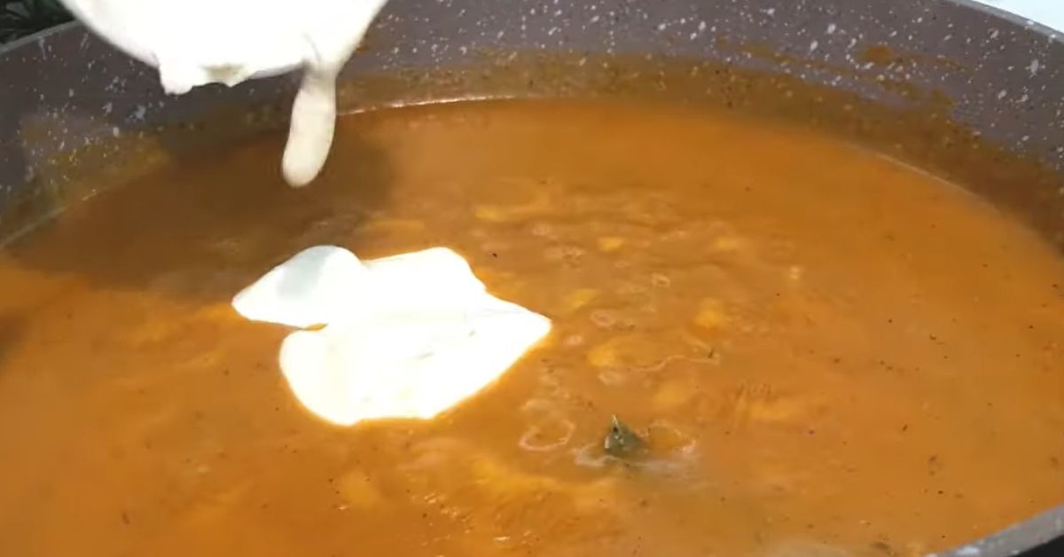 Podgrzej masło na małym ogniu. Jeśli zacznie się przypalać, dodaj trochę warzyw. Gdy masło się rozpuści, wsyp mąkę pszenną, aż nabierze złotobrązowego koloru. Dodaj koncentrat pomidorowy i jeszcze raz wymieszaj. Dodawaj wodę, aż wszystkie składniki dobrze się połączą.
