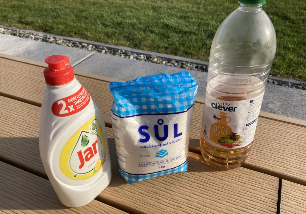 3,8 litra octu 1/4 szklanki detergentu 2 szklanki soli Dodatkowo potrzebujesz butelki z rozpylaczem do aplikacji środka.