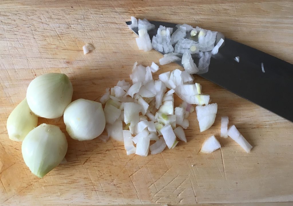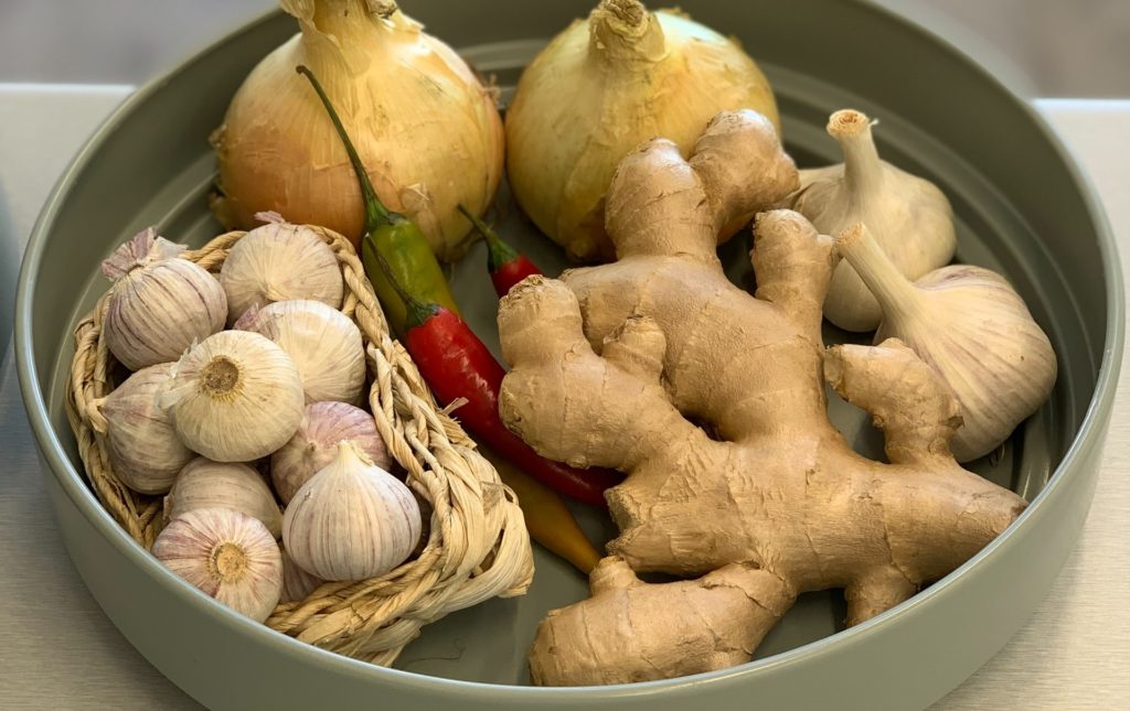 Jak przyrządzić: Obierz cebulę, posiekaj drobno. Czosnek też oczyść, nożem siekaj. Imbir zważ, 30 gramów potrzebujesz. Obierz i w plasterki go skrój.