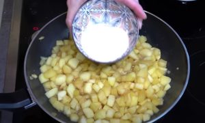 Wyciśnij sok z połowy cytryny. Jabłka obrać, usunąć rdzeń i pokroić w drobną kostkę. Umieść je na patelni, dodaj sok z cytryny i 3 łyżki cukru. Gotować, aż jabłka puszczą sok, a cukier się rozpuści. Następnie dodaj cynamon, zamknij pokrywkę i gotuj na wolnym ogniu przez 10 minut, od czasu do czasu mieszając, aby jabłka zmiękły. Wymieszaj 50 mililitrów soku jabłkowego ze skrobią. Do garnka wlej kolejne 50 mililitrów soku jabłkowego, następnie sok ze skrobią i mieszaj, aż masa zgęstnieje.