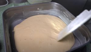 Na koniec dodać roztopione masło i ponownie wymieszać. Tortownicę o wymiarach 22×22 cm wysmarować tłuszczem lub wyłożyć papierem do pieczenia i przełożyć do niej ciasto. Pieczemy w nagrzanym piekarniku do 180°C przez około 20 minut.