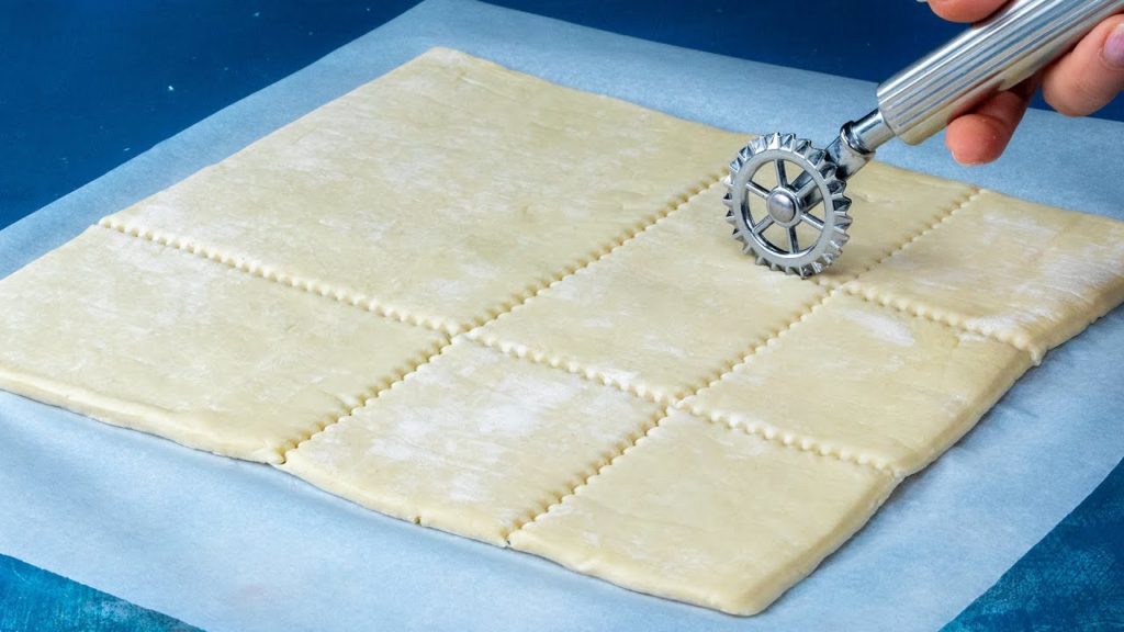 Ciasto francuskie kroimy radełkiem na kwadraty, uzyskując efektowne brzegi.