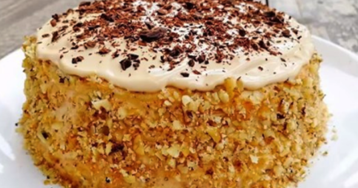 Całość – łącznie z bokami – smarujemy masą śmietankowo-karmelową, obsypujemy orzechami i śliwkami, dekorujemy czekoladą. Nasze ciasto z patelni jest gotowe!
