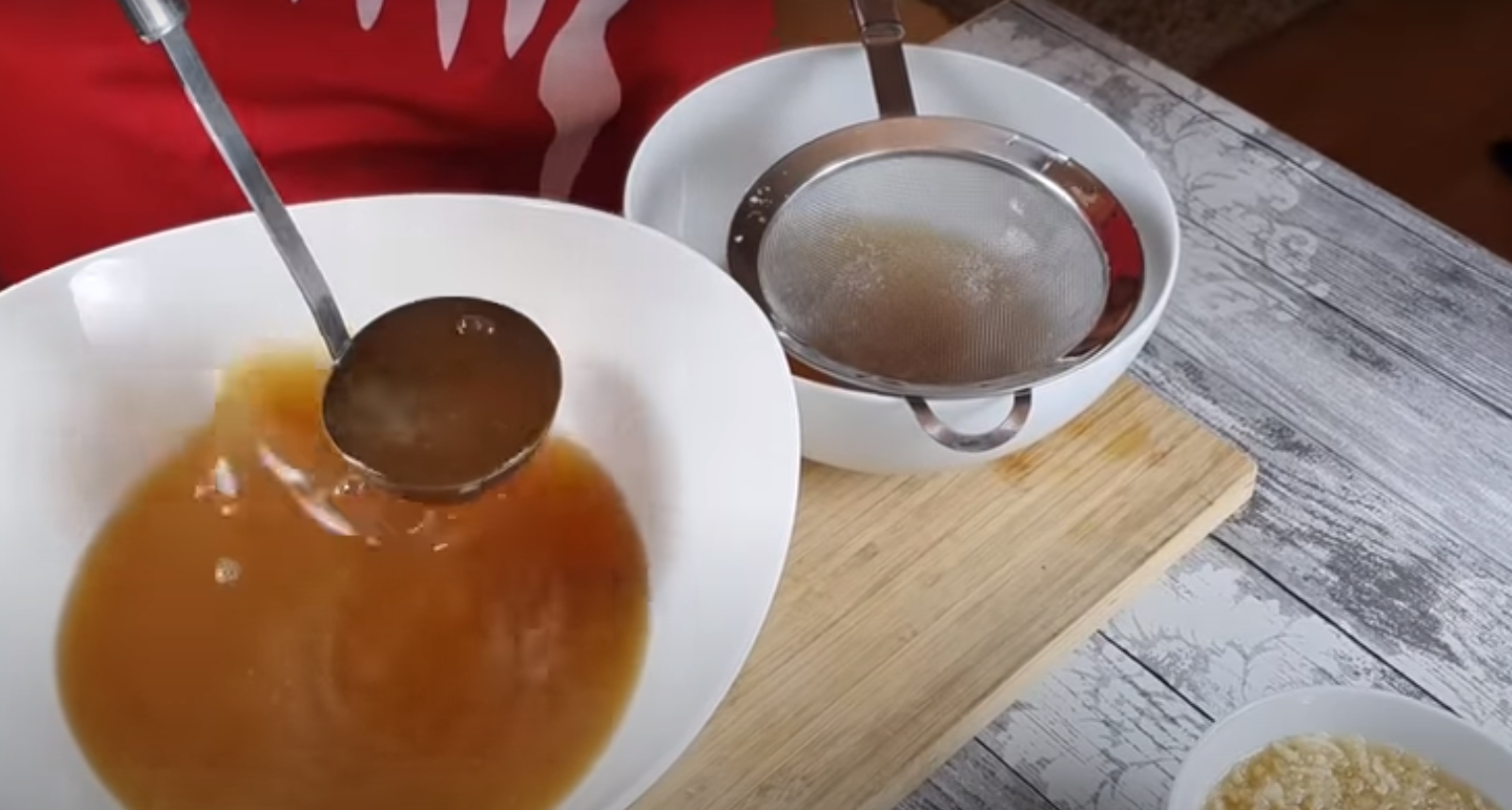 Tak przygotowany czosnek zostawiamy na 5 minut a następnie dwukrotnie przecedzamy pozostały bulion. Następnie odcedzamy czosnek z bulionu i po raz trzeci przecedźmy bulion przez sitko, na którym tym razem pozostał czosnek.