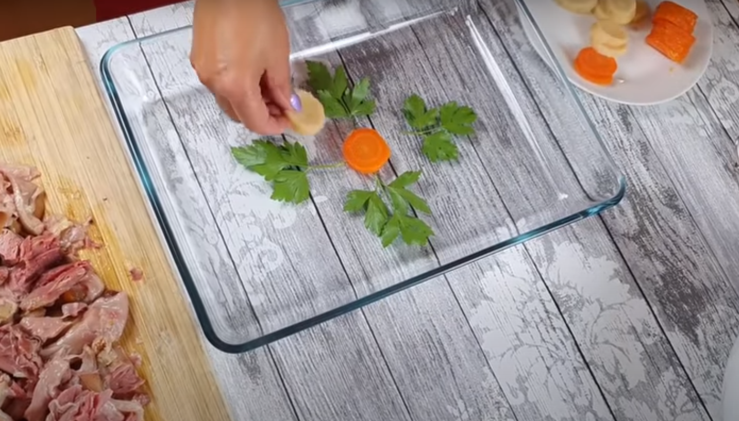 Następnym krokiem będzie ułożenie liści i natki pietruszki wraz z posiekaną marchewką na dnie naczynia. Pozwoli nam to uzyskać piękny wzorek na wierzchu galaretki.