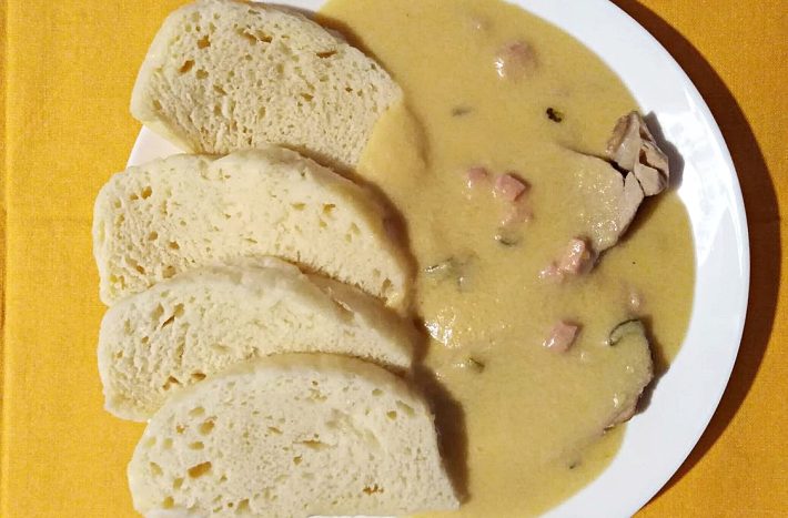 Mięso kroimy w plastry i podajemy polane sosem śmietanowym razem z knedlami lub z ryżem lub makaronem.
