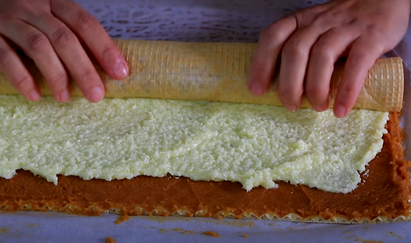 Następnie, przystąp do przygotowywania drugiego nadzienia. W naczyniu rozpuść masło, cukier i dodaj wodę. Stale mieszając na umiarkowanym ogniu, wprowadź mleko w proszku. Gdy składniki będą dobrze połączone, dodaj do mieszanki wiórki kokosowe. Tę drugą masę nałóż na już rozłożoną warstwę karmelową i delikatnie zawiń arkusz waflowy.