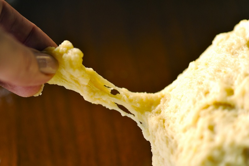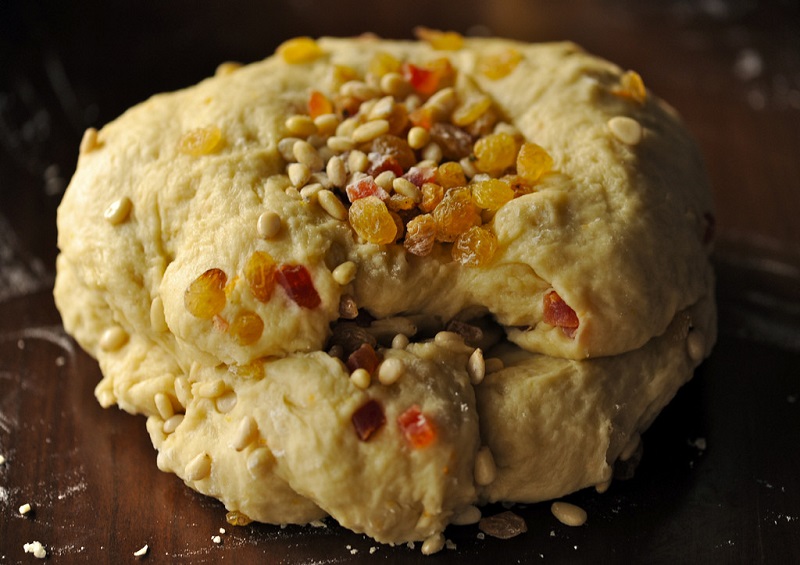 Posyp pozostałą mąką drewnianą powierzchnię (blat lub deskę, stolnicę itp.). Umieść masło w małym dołku w mące. Dodaj do mąki jajka, żółtka i pozostały cukier. Teraz nadszedł czas na zagniatanie ciasta. Wyrabiaj ciasto przez 10 minut, aż stanie się elastyczne i rozciągliwe. Konsystencję ciasta można porównać do gumy do żucia.