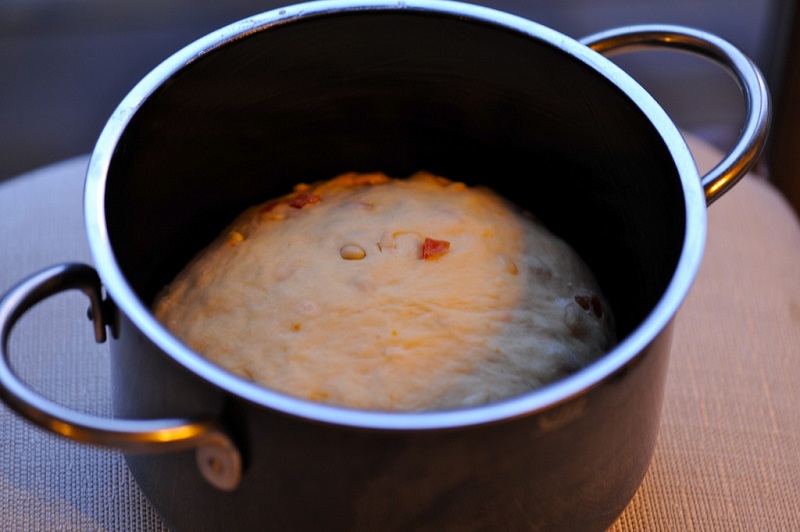 Gotowe? Dodaj orzechy, owoce i rodzynki sułtańskie. Połącz wszystko. Na jedną i ćwierć godziny umieść ciasto w ciepłym miejscu. W tym czasie ciasto powinno podwoić swoją objętość. Przygotuj naczynie do pieczenia. Dno wyłóż papierem do pieczenia. Ciasto powinno być wypełnione do 1/3 naczynia do pieczenia.