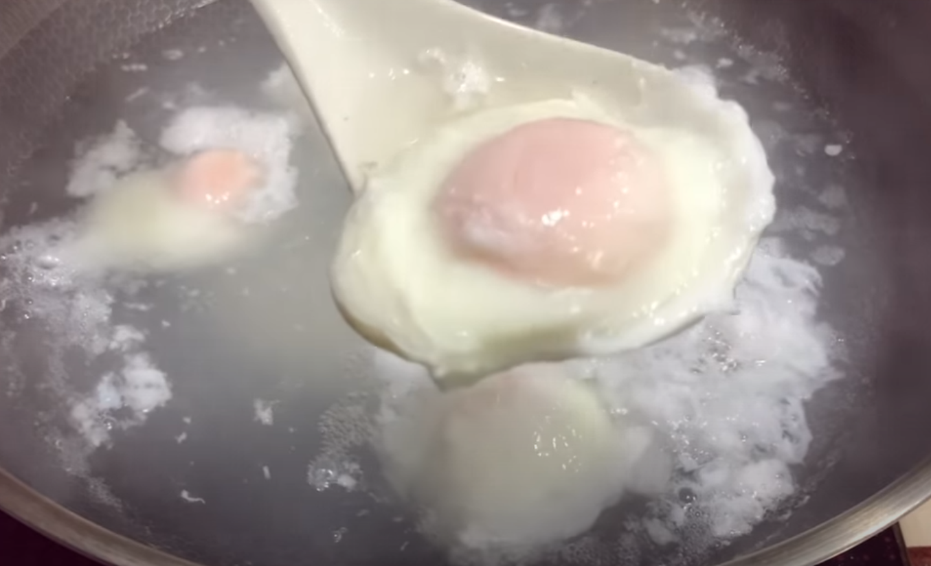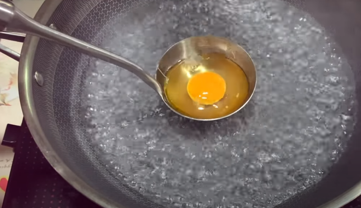 W głębszej patelni doprowadź wodę do wrzenia, a następnie połóż w niej chochlę nasmarowaną olejem. Wbij do niej jajko i gotuj, aż białko się zetnie, potem zanurz jajko w wodzie i gotuj pod przykryciem przez 3 minuty.