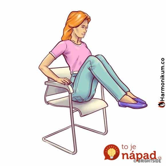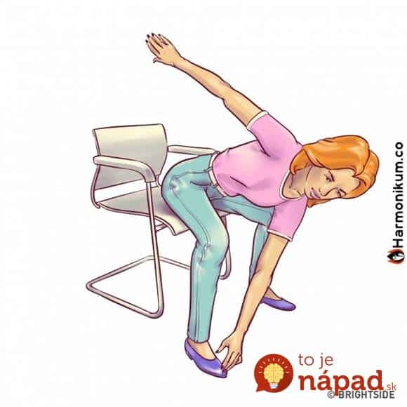 Aby wykonać to ćwiczenie, usiądź na końcu krzesła i utrzymaj równowagę. Pochyl się do przodu i dotknij lewej stopy prawą ręką, a następnie dotknij prawej stopy lewą ręką. Staraj się utrzymać prosty kręgosłup przez całe ćwiczenie. To doskonały sposób na spalanie tłuszczu w dolnej części brzucha i biodrach. Powtórz ćwiczenie 20-30 razy.