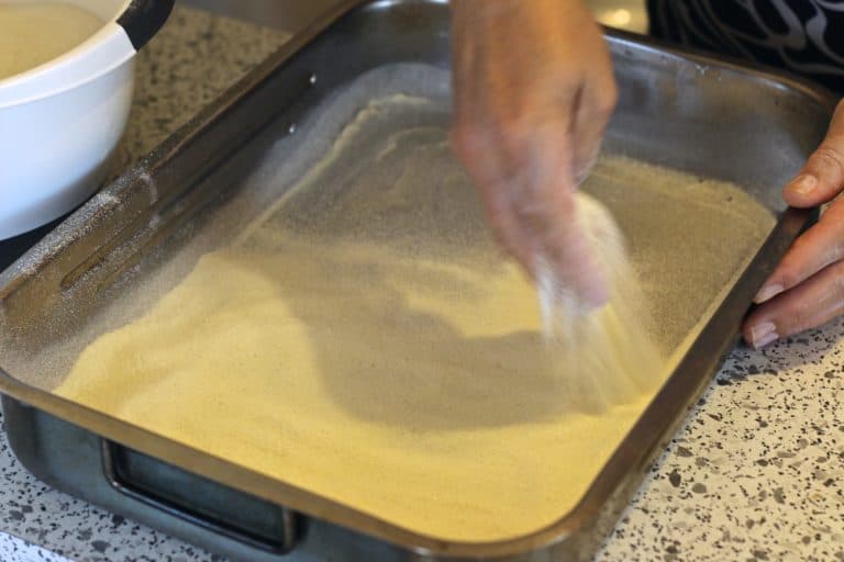 Blachę należy nasmarować masłem i obsypać mąką. Na przygotowanej blasze rozprowadzamy warstwę suchej mieszanki, tak aby była ona wystarczająco gruba, lecz nie na tyle, aby dna blachy było widoczne.