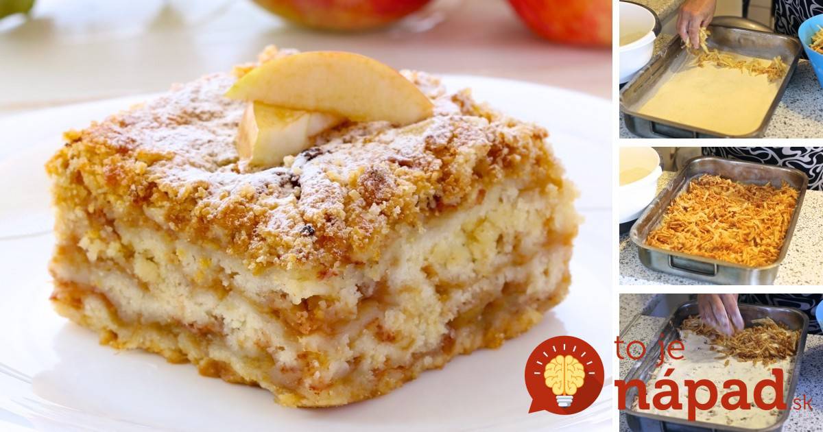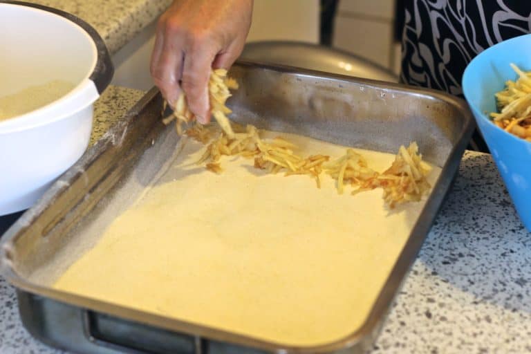 Następnie na suchą mieszankę kładziemy starte jabłka wraz z sokiem, starając się nie ugniatać ich zbytnio. Powtarzamy proces, układając kolejno suchą mieszankę i jabłka. Ostatecznie, całość posypujemy pozostałą częścią suchej mieszanki i ścieramy na wierzch masło lub margarynę.