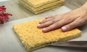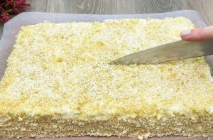 Na każdą parę cienkich plastrów ciasta nałóż warstwę kremu, układając kolejne warstwy ciasta i kremu. Ostatnie warstwy ciasta posmaruj resztą kremu, pokrywając również boki. Na wierzchu ciasta posyp kruszonką, dociskając ją do boków, a całość udekoruj wiórkami kokosowymi. Schłodź gotowy deser w lodówce przez godzinę.