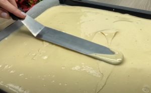 W misce połącz jogurt, mascarpone i cukier puder, ubijając do uzyskania jednolitej masy. Po upieczeniu i ostudzeniu biszkoptu, usuń papier do pieczenia, wygładź brzegi i podziel biszkopt na ćwiartki, które następnie przekrój na cienkie warstwy. Zmielone brzegi przekształć w drobną kruszonkę.
