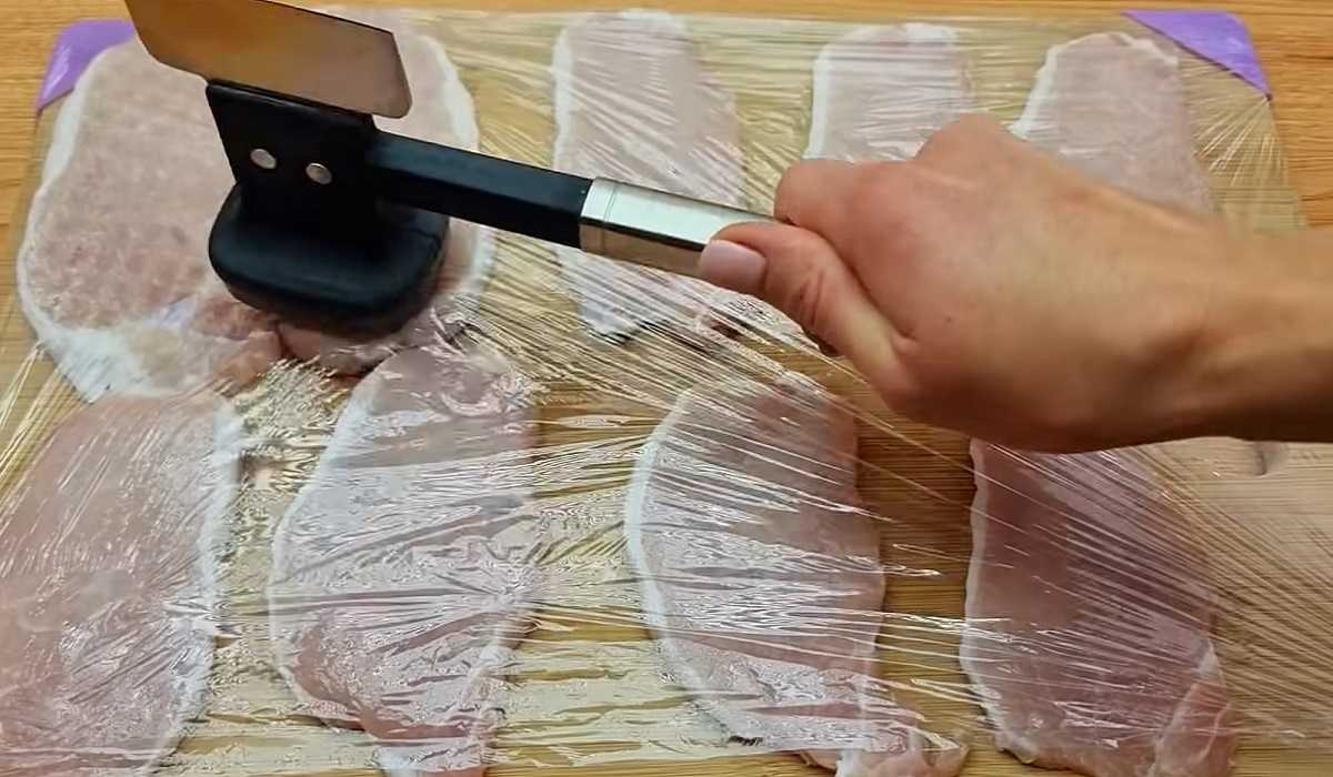 W międzyczasie kroimy mięso w cienkie plastry (tak jak na schabowe), przykrywamy folią spożywczą i ubijamy tłuczkiem. Następnie smarujemy je z każdej strony pieprzem i solą.