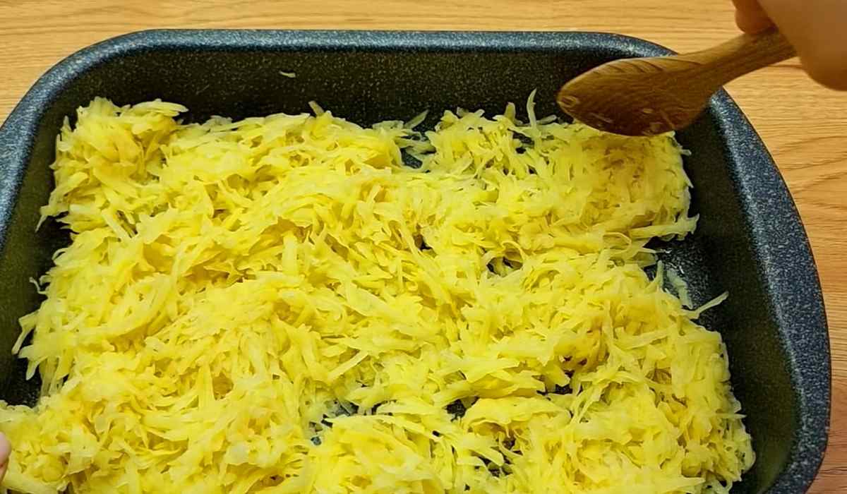 Wyciągamy naczynie na naszą zapiekankę, smarujemy je olejem i rozkładamy równo starte i posolone wcześniej ziemniaki. Następnie obieramy cebulę, kroimy ją w piórka i układamy na ziemniakach. Kolejnym krokiem będzie ułożenie mięsa na warstwie cebuli.