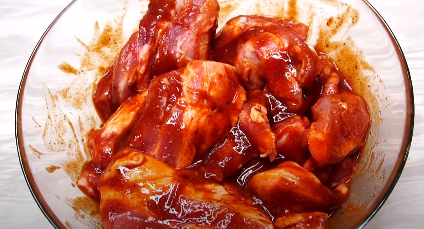 Całość należy dokładnie wymieszać, a następnie wszystkie żeberka należy przełożyć do dużej miski i zalać zrobioną marynatę. Wszystko trzeba przykryć folią spożywczą i pozostawić w marynacie przez około 30 minut.
