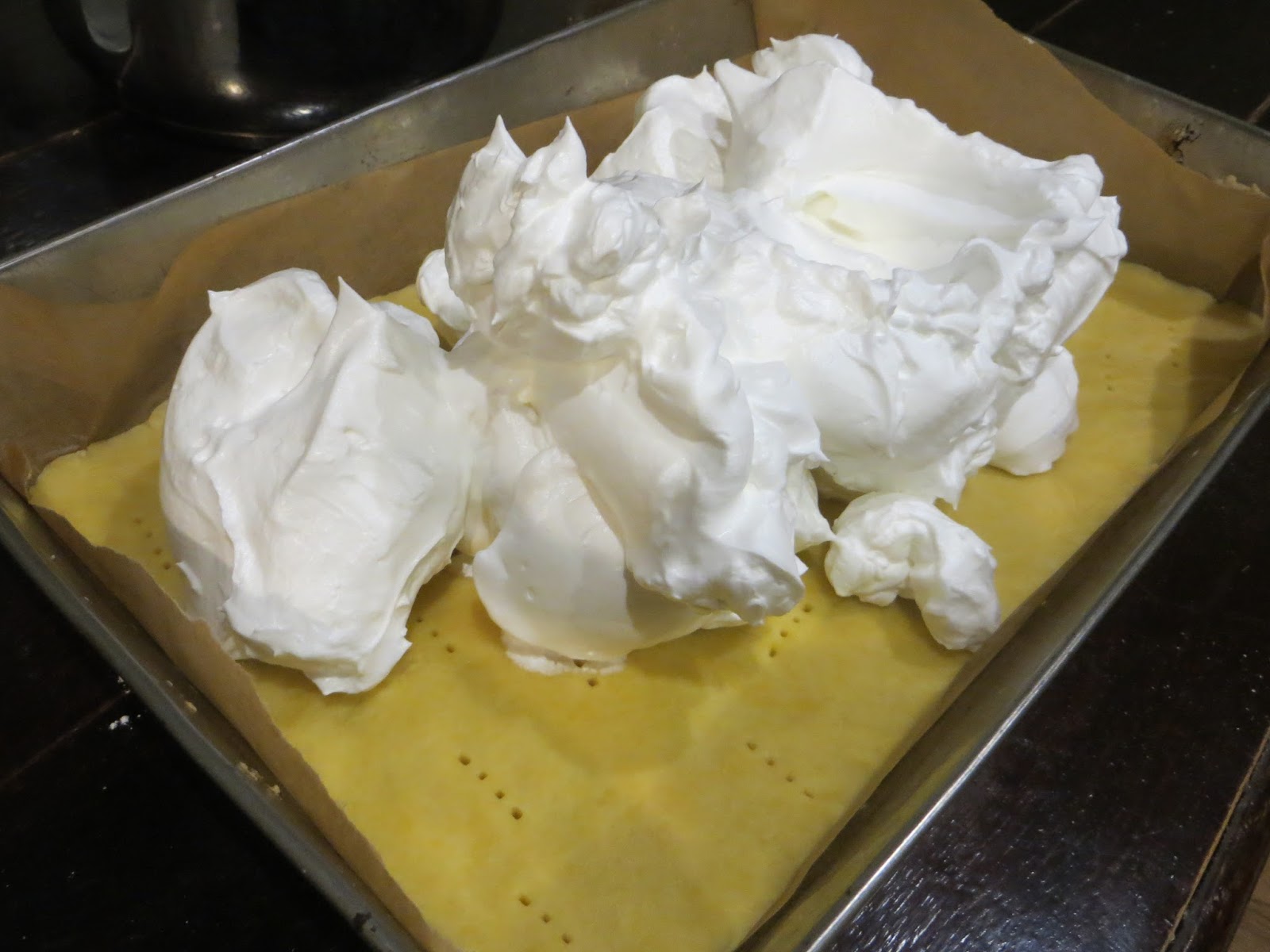 Na początku ubijamy białka na sztywną pianę razem z cukrem pudrem i wykładamy na blachę wyłożoną kruchym ciastem. Wszystko wyrównujemy, a następnie posypujemy płatkami migdałowymi.