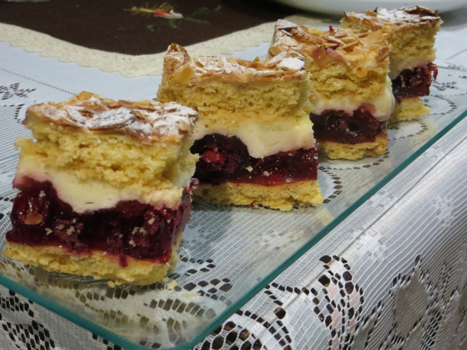 Ciasto jest połączeniem niezwykle delikatnego kruchego spodu z kwaskową masą stworzoną z wiśni. Dołącza do tego przyjemnie słodka śmietankowa pianka i warstwa migdałów.