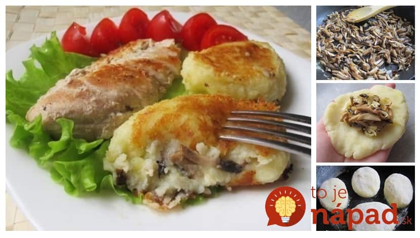 Z puree ziemniaczanego formujemy naleśniki, na środku których układamy łyżkę nadzienia grzybowo-cebulowego. Następnie formujemy kotlety w klopsiki z nadzieniem w środku. Obtaczamy je w mące lub bułce tartej i smażymy na złoty kolor.